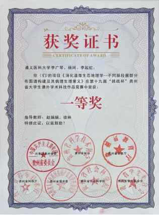 2022级本科生李广琴、2020级本科生李起虹、2021级南山班本科生杨珂合作完成的项目《消化道微生态地理学—不同肠段菌群分布图谱构建及其病理生理意义》,荣获省级一等奖。